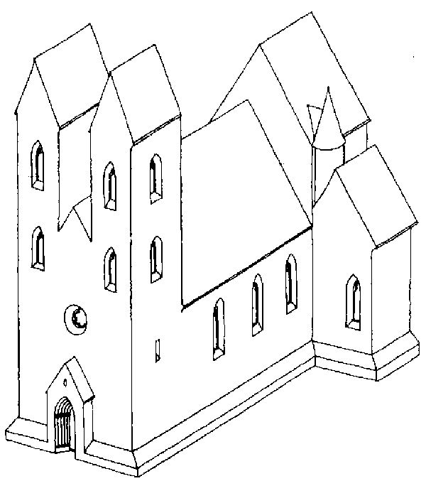 “Csak keletelt, egyenes záródású szentélye és az ehhez délről csatlakozó négyzetes sekrestyéje ismert, gótikusan átépített formában. A sekrestye templom felőli, északnyugati sarkában csigalépcső vezetett a szentély boltozata feletti kápolnába. A szentélyt a sarkokba állított oszlopokra támaszkodó bordás keresztboltozat fedte, a sekrestye boltozatának bordái pedig magasan, a falsarkokra támaszkodtak. A szentély keleti végén magas és keskeny koragótikus ablak van, hasonlókat, de kisebb méretűeket találunk a sekrestye keleti és déli oldalán is, az utóbbinak csak a fele maradt meg. — Románkori formáját nem ismerjük.”