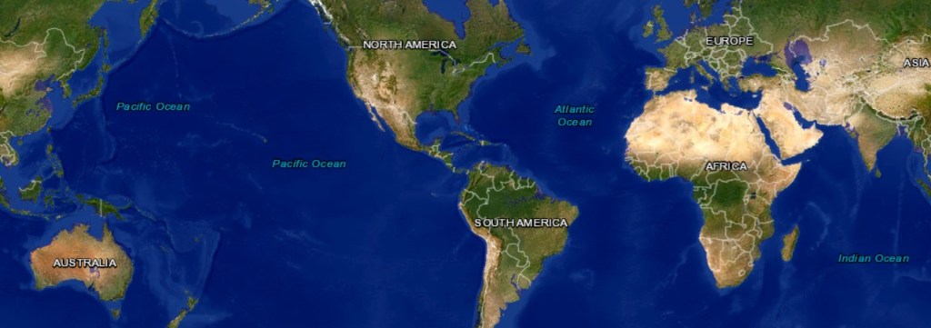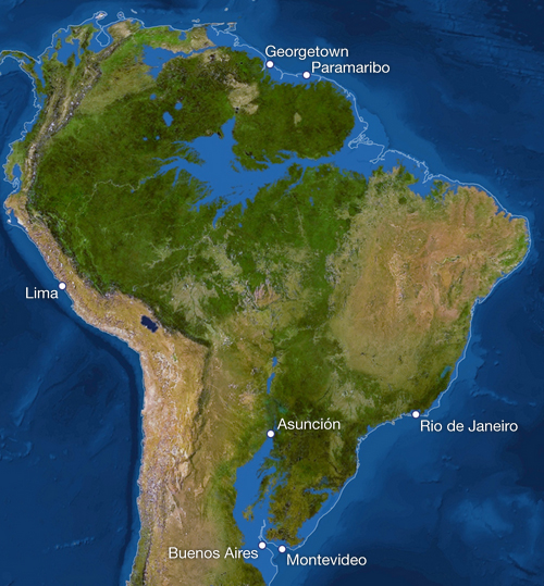 Dél-Amerika három legnagyobb folyóvölgyében nyomul fel a sós víz a kontinens belsejébe. Az Orinoco és az Amazonas partján kiirtott őserdő helyén épült települések elpuszulnak, ugyanúgy a La Plata torkolat környéke, ahol legfeljebb a paraguayiak örülhetnek, hogy a fővárosuknak lesz egy új tengeri kikötője. Többé nem lesz már szükség a Panama-csatornára, a hajók akadálytalanul közlekedhetnek majd a két óceán között. Ezen a térképrészleten is felbukkannak nagyobb kék foltok a szárazföld belsejében. Ezek a valóságban nem válánának vízfelületté, mint ahogy a Death Valley, az alább említett Kattara-mélyföld sem tenger jelenleg, csak gondolom az automatikus színezésnél befestődtek ezek a mélyebb területek.Az amerikai kontinens északi részén elsősorban a keleti part veszélyeztetett, Florida eltűnésével alaposan le fog rövidülni a hajózó útvonal Kanada és Mexikó között. Főleg úgy, hogy tengervíz alá kerülhet a Hudson-folyó völgyének tektonikai árka. A Nagy-tavakat nem fogja érinteni a tengerszint-emelkedés, a legalacsonyabb Ontario-tó víztükre jelenleg 75 méterrel emelkedik a Atlanti-óceán fölé. Valamivel nagyobb lesz majd az öböl San Francisco városánál; az egész Sacramento-völgyben tenger fog hullámozni. A Mississippi-deltát pedig 650 kilométerrel északabbra kell majd keresni.